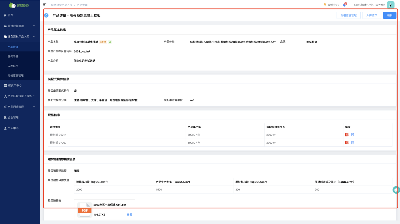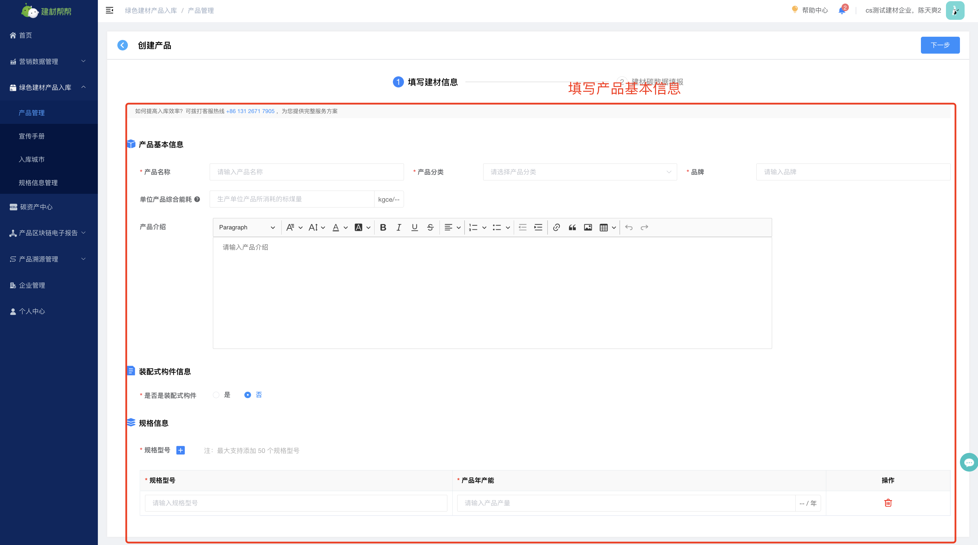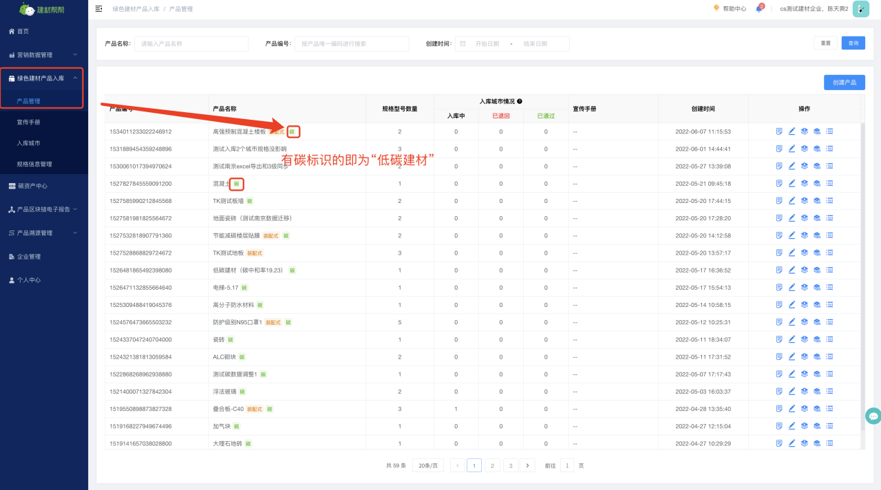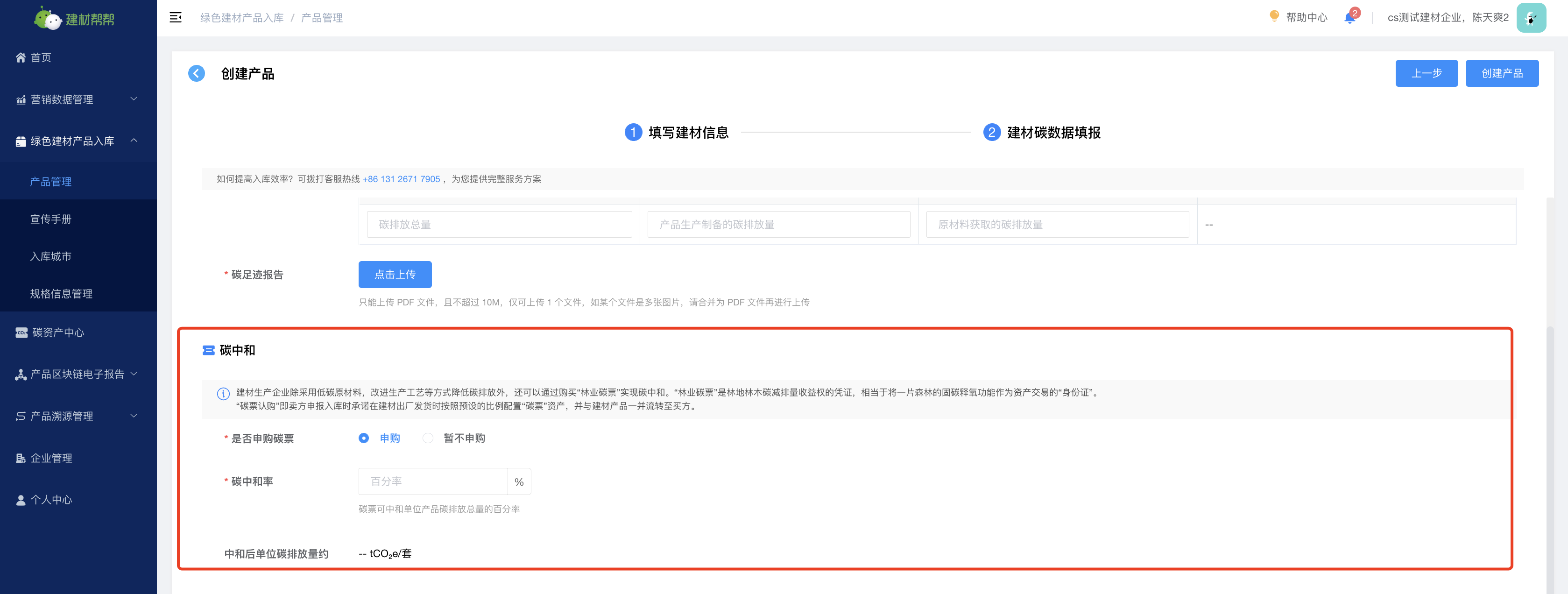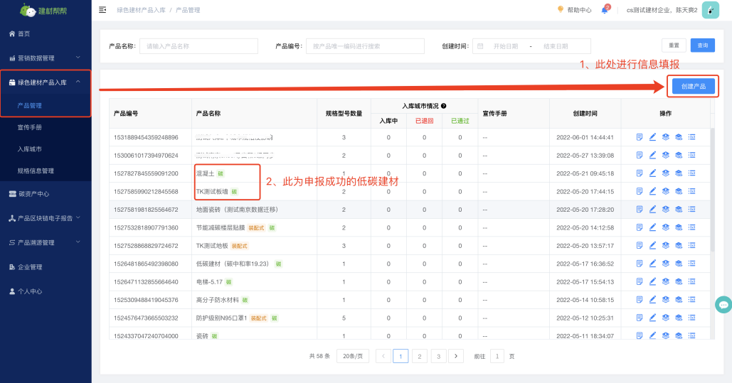 (1)创建低碳建材产品--点击“创建产品”进行信息填报