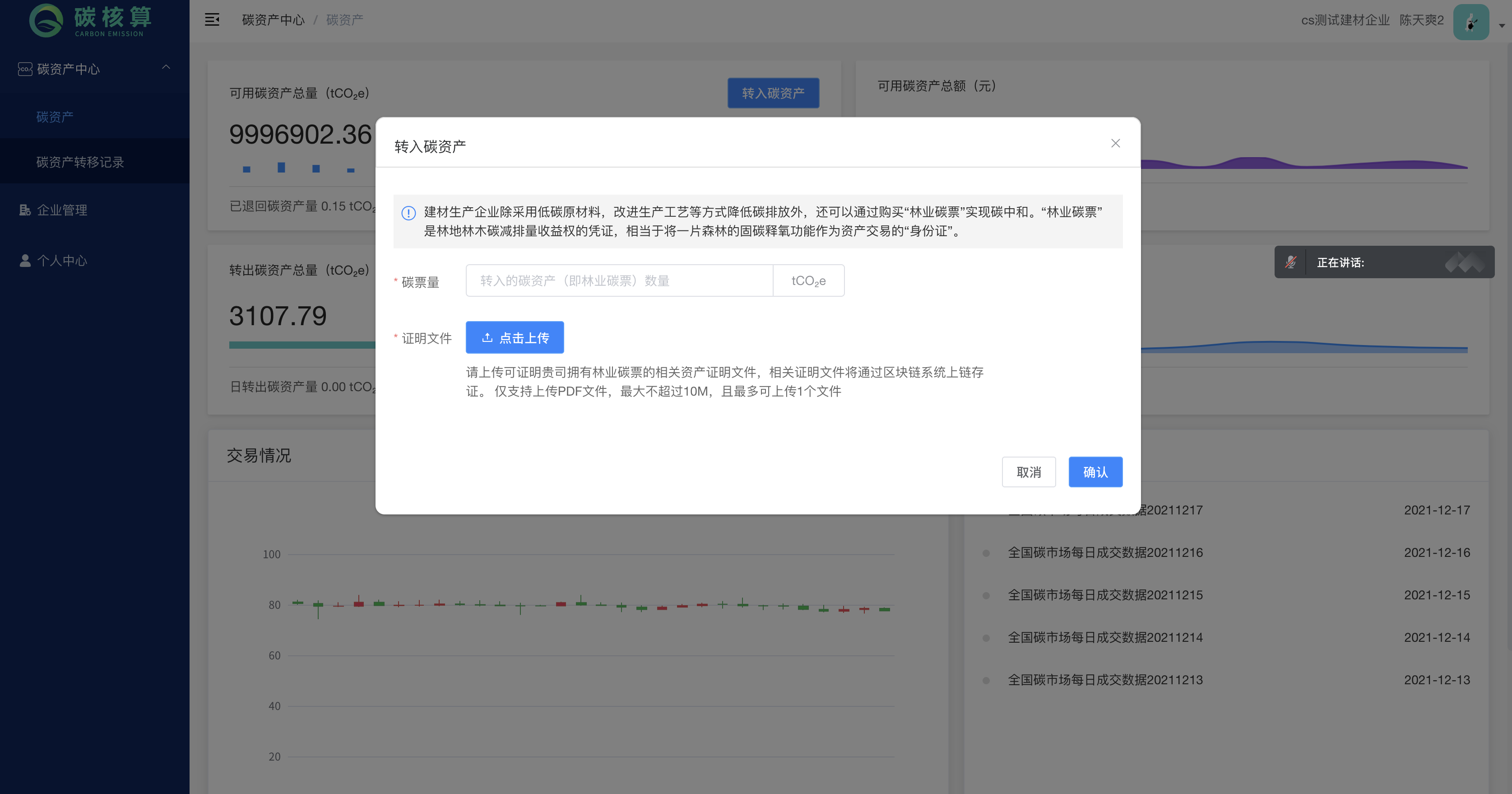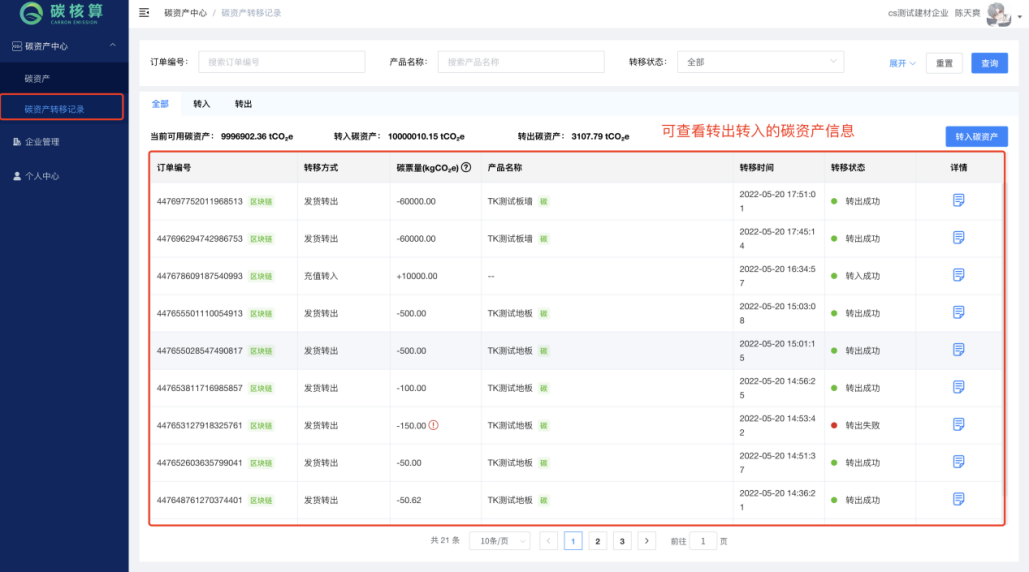 查看历史碳资产的转移情况,以便于分析数据